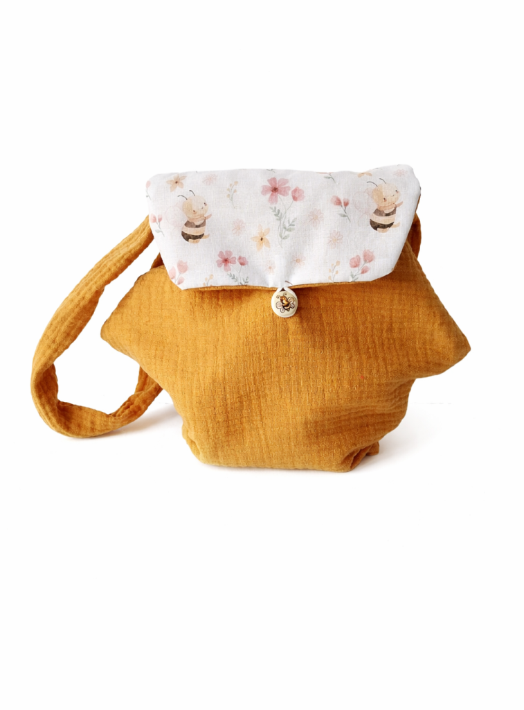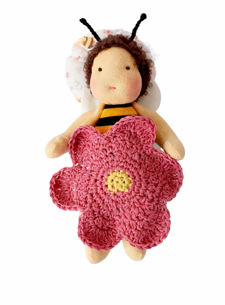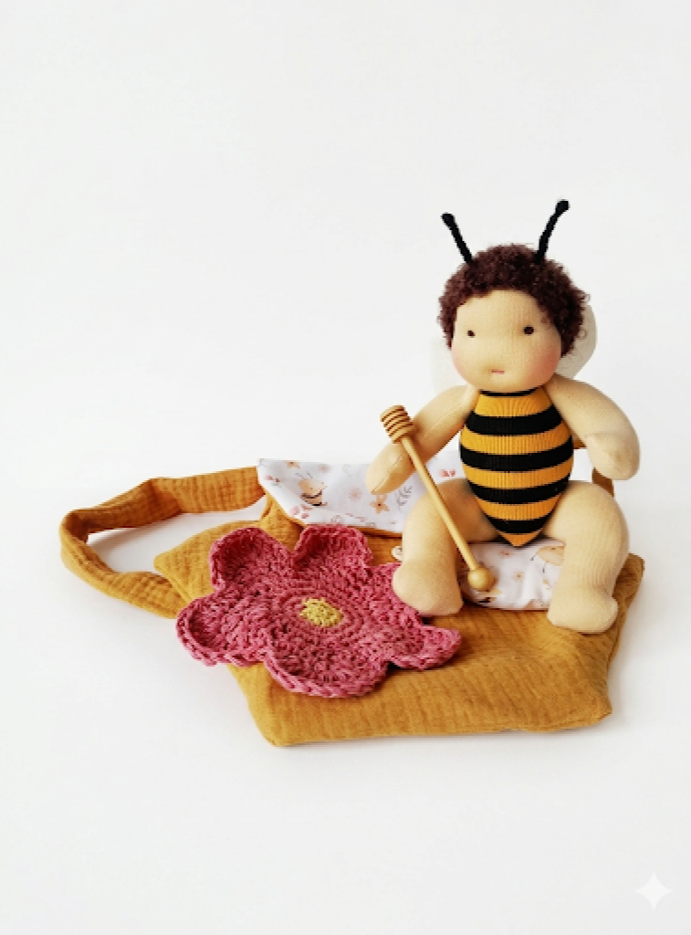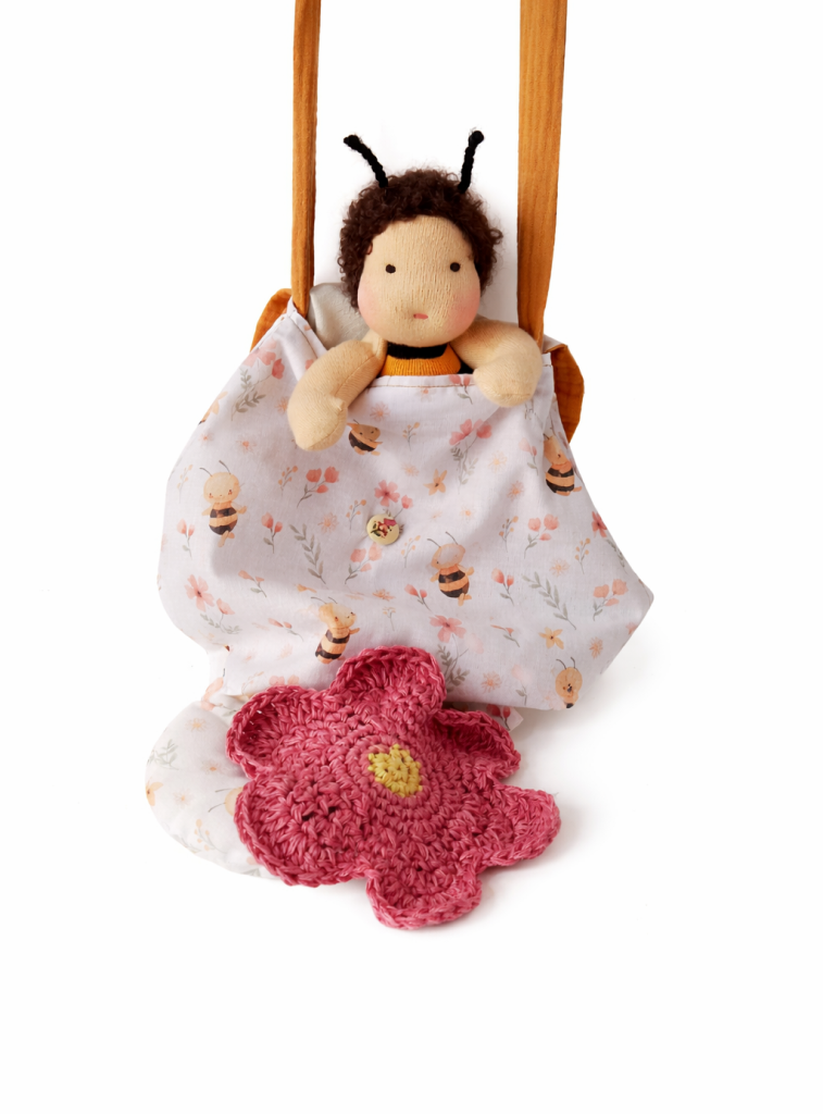 Bolso de algodón reversible, abeja articulada, almohada, mantita flor y cuchara de miel.