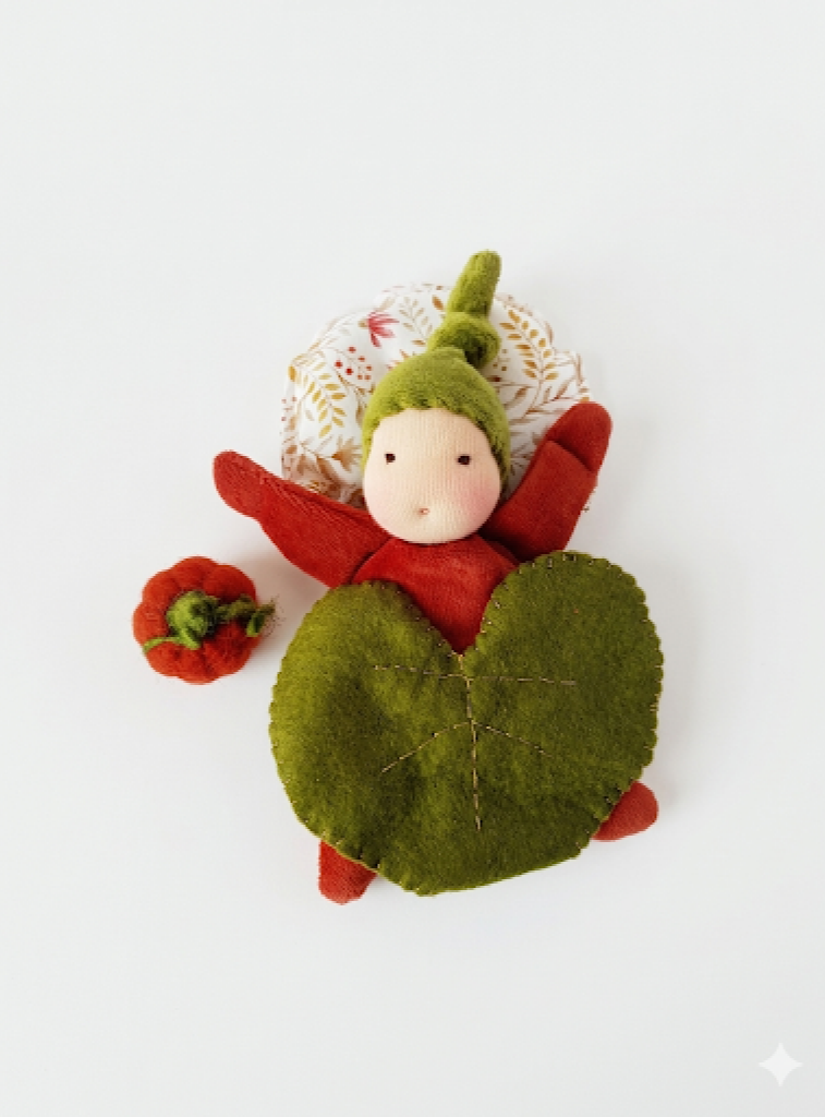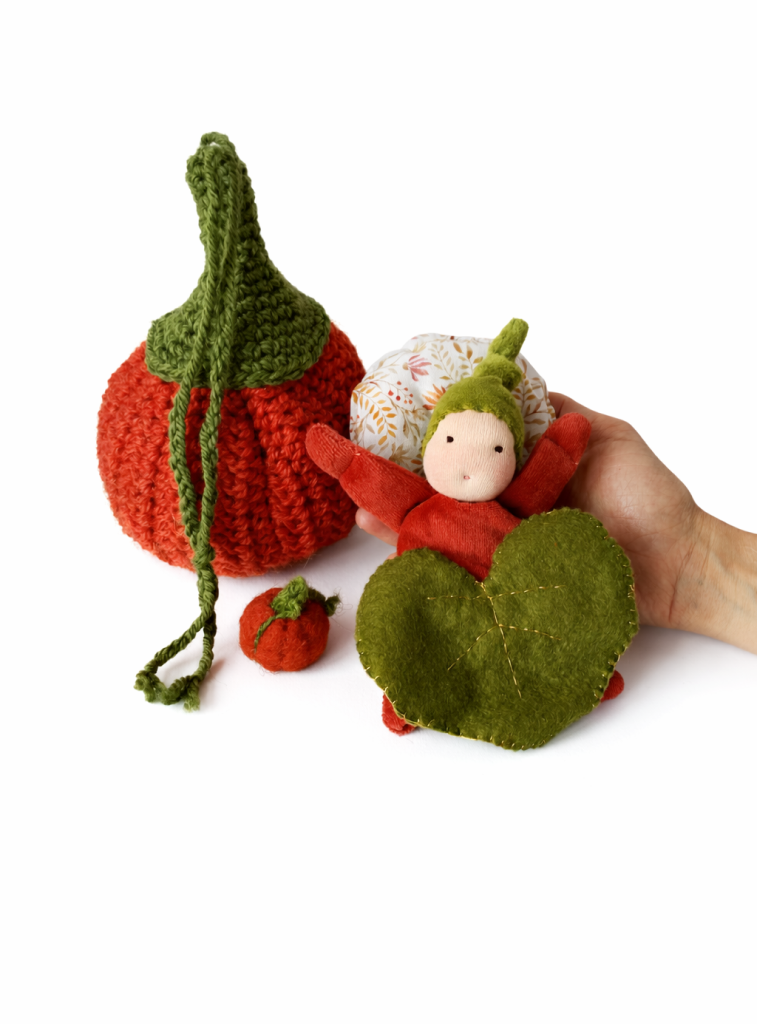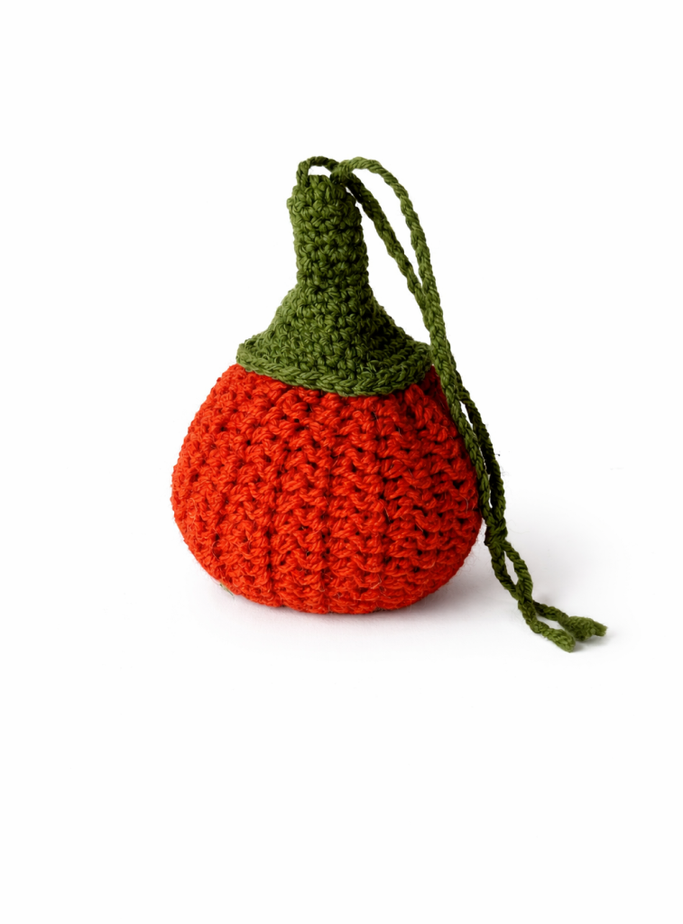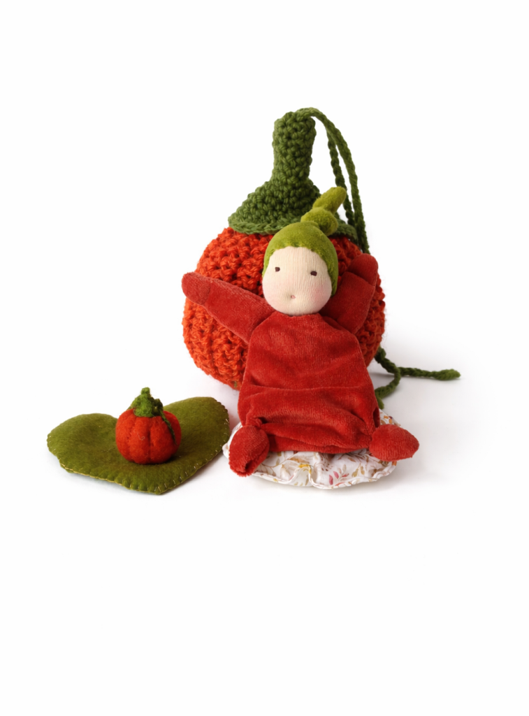 Calabaza de ganchillo con muñeco, almohada, hoja y juguete.