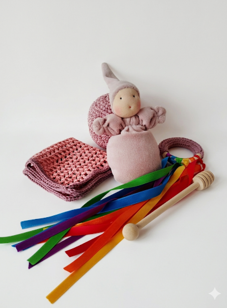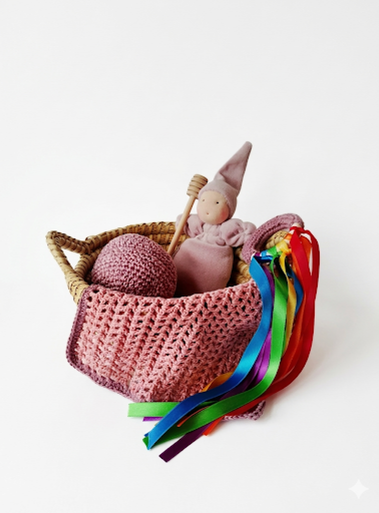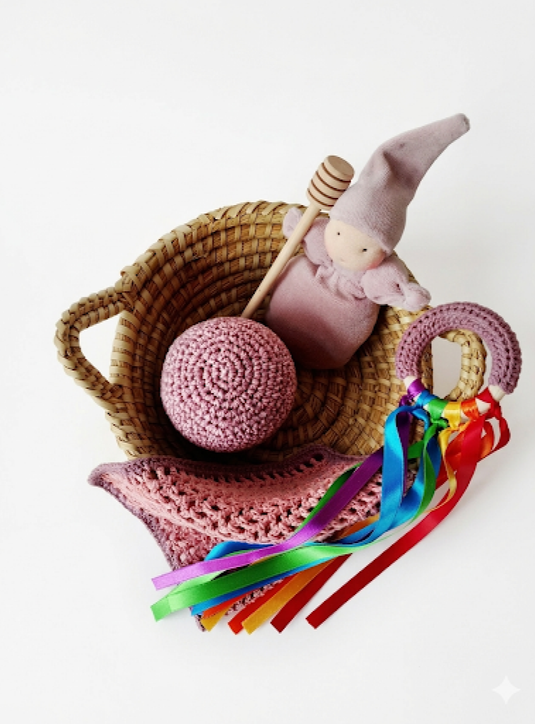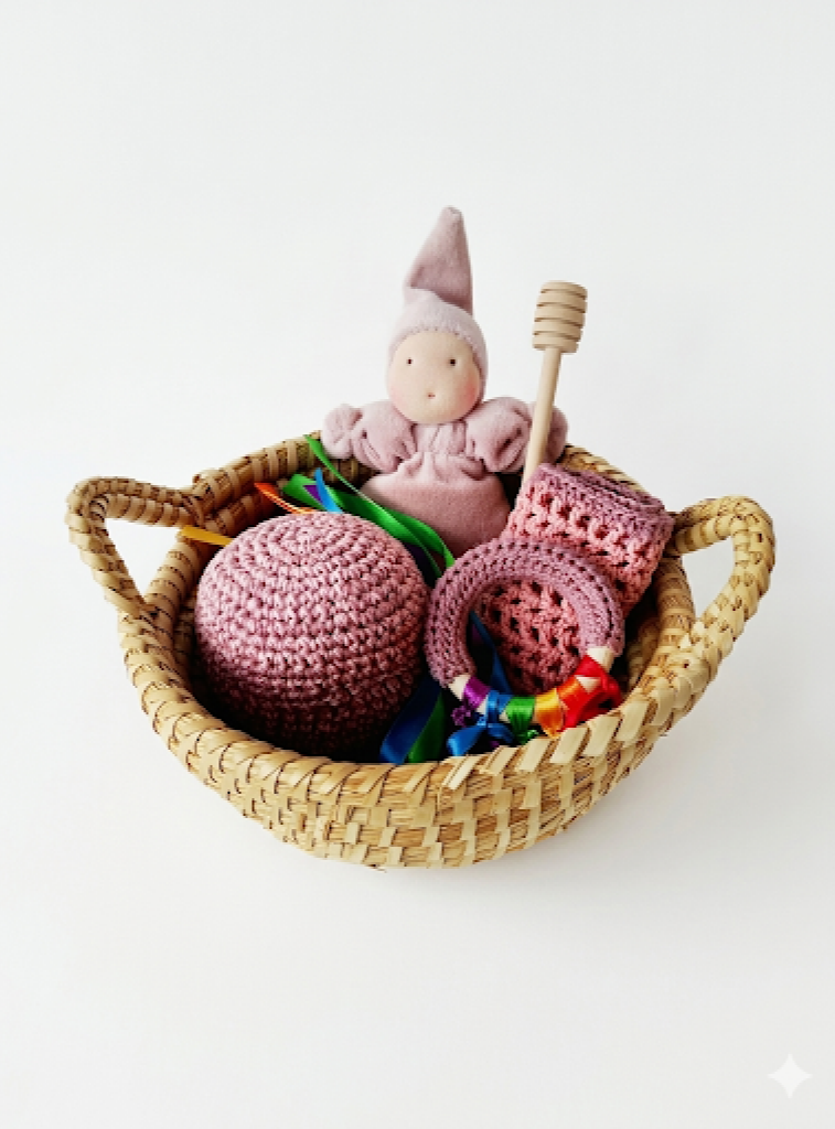 Cesta de mimbre con muñeca pequeña, mantita, mordedor, pelota y cuchara de miel.
